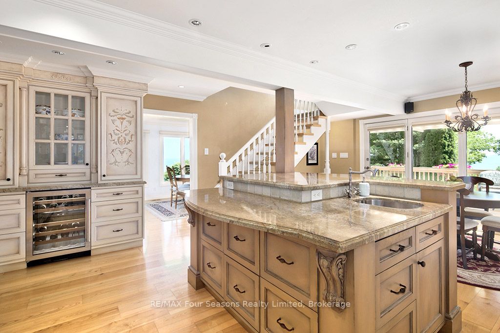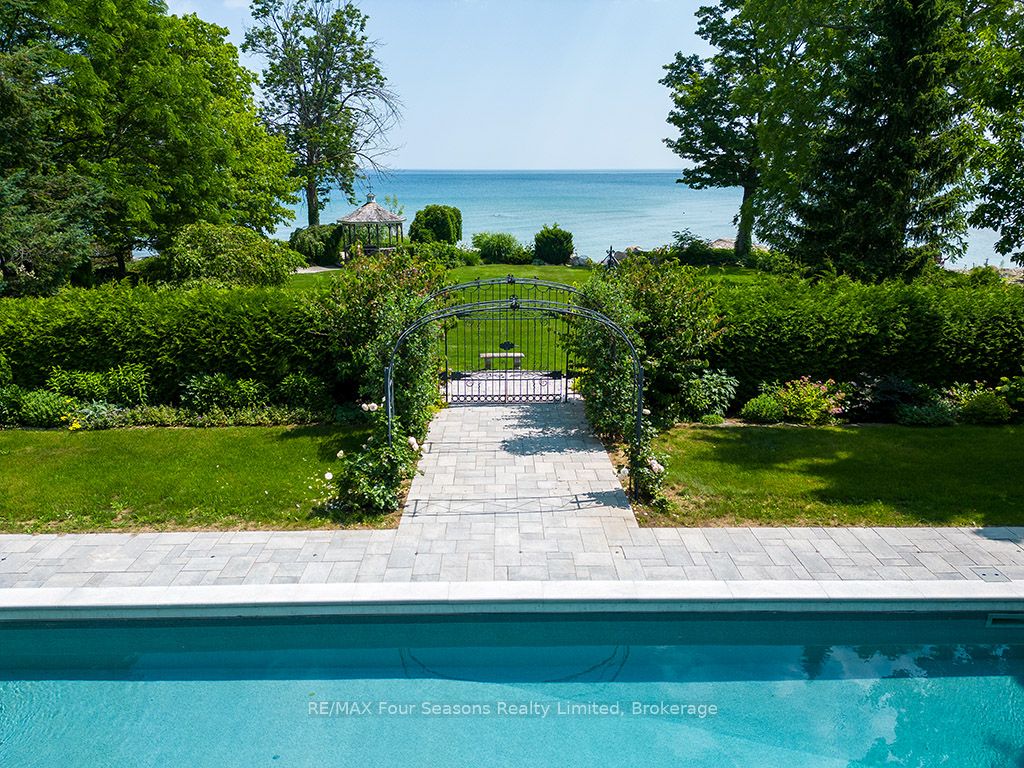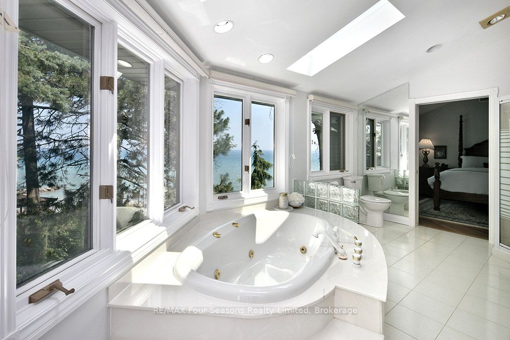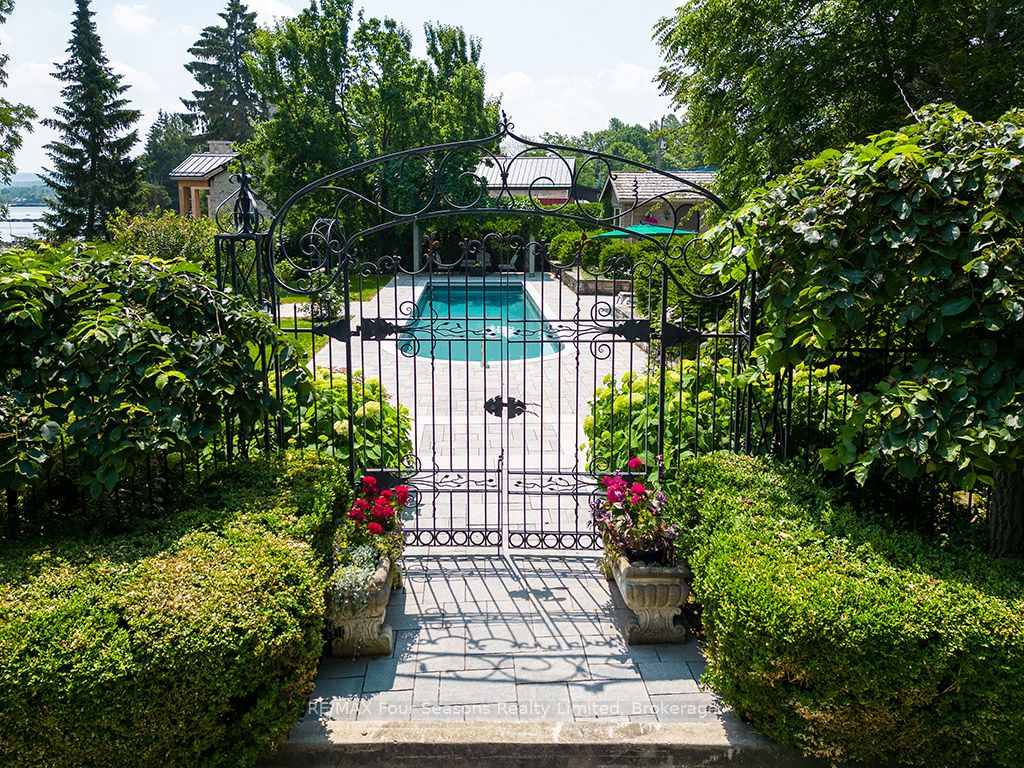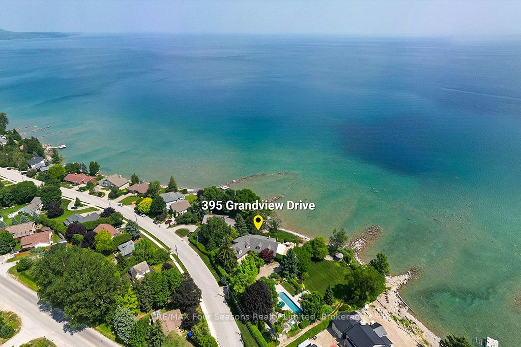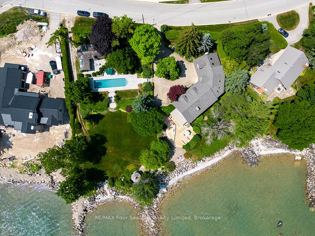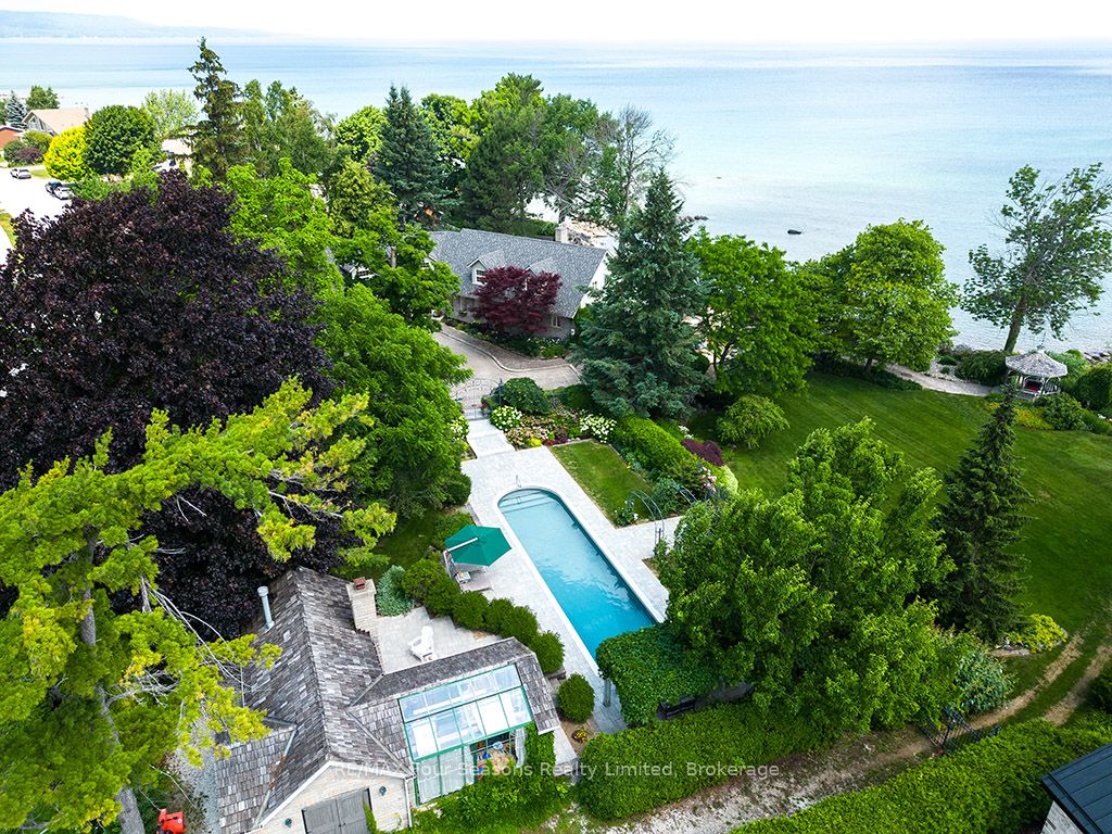 335 feet of exquisite waterfront nestled on the shores of Georgian Bay! With potential for a family compound this 4+1 bed, 4-bath home spans over 4,000 sq. ft. of beautifully appointed living space, with panoramic lake views and a resort-like setting. Arrive via a private gated circular drive and step into a secluded, park-like oasis featuring manicured grounds, a heated in-ground saltwater pool, with a stone English Potting Shed waiting for your ideas, a waters-edge gazebo, flagstone patios and tiered decks that lead you to the shoreline. Inside, Swedish Pine floors set a warm, elegant tone throughout. The main floor features a stunning living room with coffered ceilings, 2-sided gas fireplace, built-ins, and picture windows that perfectly frame the vistas. The layout flows from the living room into a formal dining room – maximizing light and views. The chef’s kitchen is a culinary dream, anchored by a 6-burner Viking gas range, granite countertops, a large island with prep sink, high-end appliances, and generous custom cabinetry. Upstairs, the light-filled family room with vaulted ceilings and skylights offers an inviting retreat, complemented by a cozy gas fireplace. The luxurious primary suite includes a spa-like ensuite and serene lake views, while three additional bedrooms with views of the water and two full baths accommodate family and guests in comfort. The expansive lower-level games and recreation room offers endless entertainment potential and two Murphy beds for overflow guests. New roof and skylights, both furnaces, pool and decking, windows, and renovated baths. Located just minutes to downtown shops and restaurants, and a short drive to Blue Mountain, the private ski clubs, Bruce Trail hiking, Cross Country trails, top golf courses, cycling routes, and more – making it a true 4-season playground for outdoor enthusiasts. A stunning blend of elegance, comfort, and recreation – this Georgian Bay waterfront gem is your ultimate lakeside sanctuary.