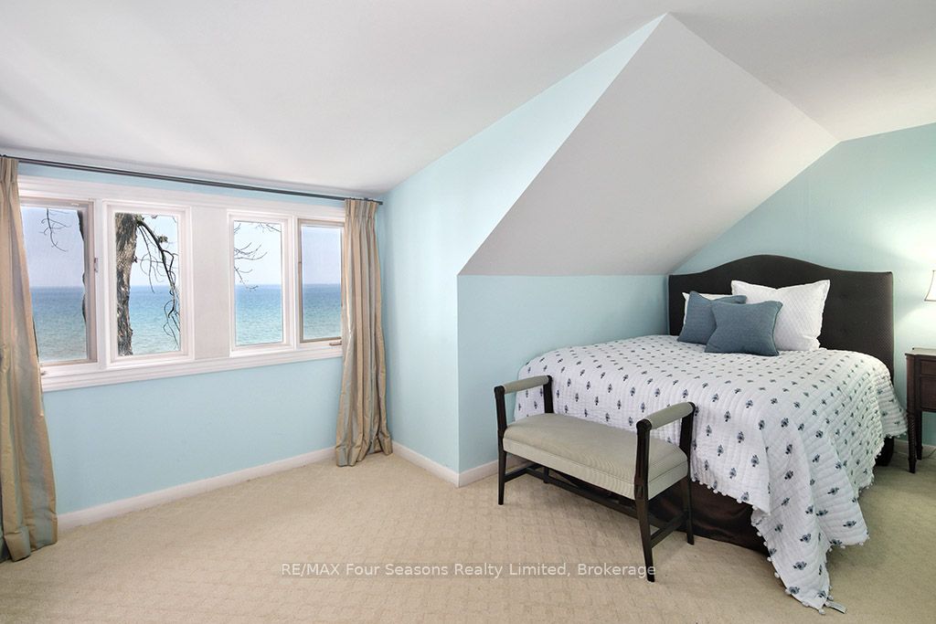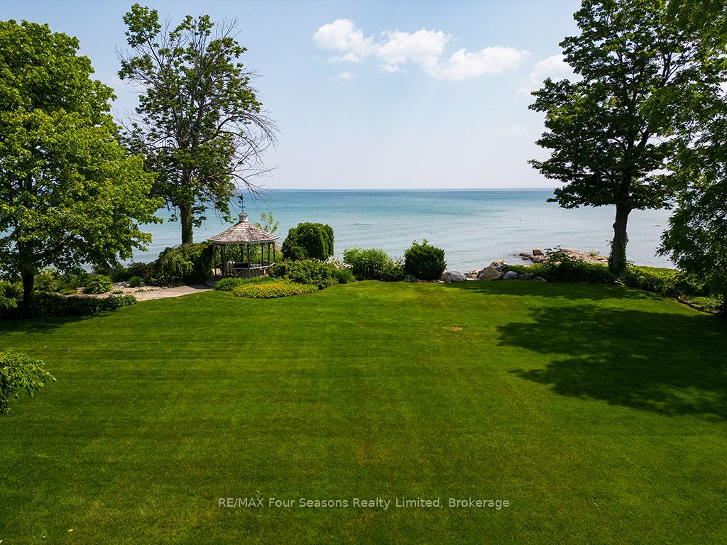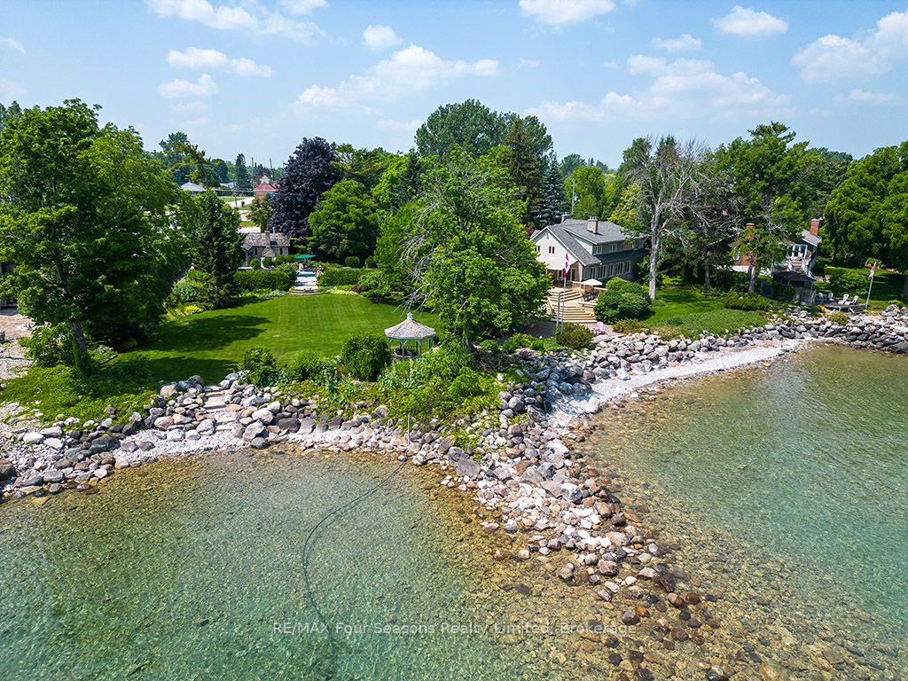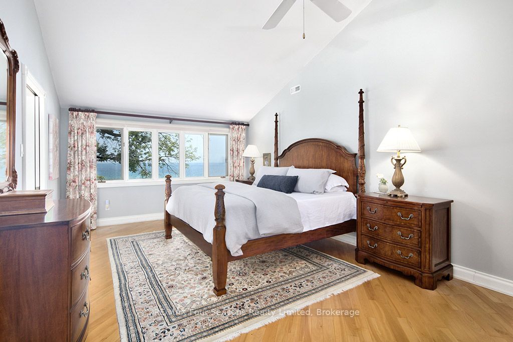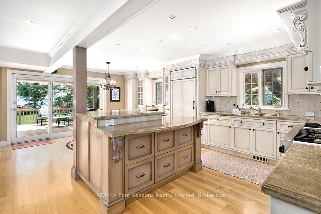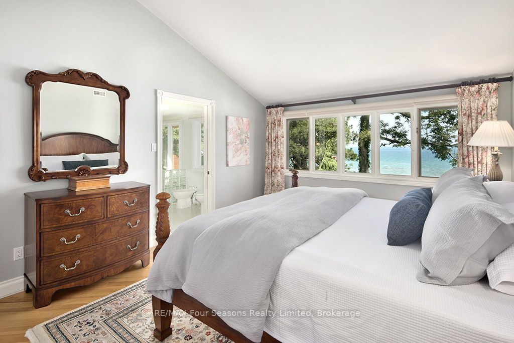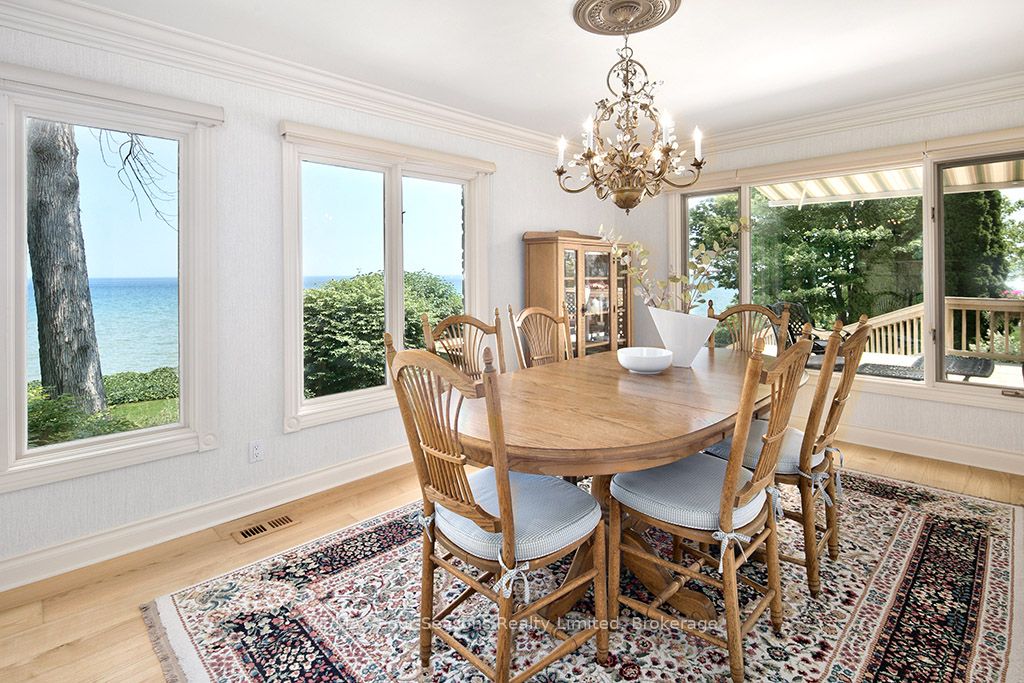 335 feet of exquisite waterfront nestled on the shores of Georgian Bay! With potential for a family compound this 4+1 bed, 4-bath home spans over 4,000 sq. ft. of beautifully appointed living space, with panoramic lake views and a resort-like setting. Arrive via a private gated circular drive and step into a secluded, park-like oasis featuring manicured grounds, a heated in-ground saltwater pool, with a stone English Potting Shed waiting for your ideas, a waters-edge gazebo, flagstone patios and tiered decks that lead you to the shoreline. Inside, Swedish Pine floors set a warm, elegant tone throughout. The main floor features a stunning living room with coffered ceilings, 2-sided gas fireplace, built-ins, and picture windows that perfectly frame the vistas. The layout flows from the living room into a formal dining room – maximizing light and views. The chef’s kitchen is a culinary dream, anchored by a 6-burner Viking gas range, granite countertops, a large island with prep sink, high-end appliances, and generous custom cabinetry. Upstairs, the light-filled family room with vaulted ceilings and skylights offers an inviting retreat, complemented by a cozy gas fireplace. The luxurious primary suite includes a spa-like ensuite and serene lake views, while three additional bedrooms with views of the water and two full baths accommodate family and guests in comfort. The expansive lower-level games and recreation room offers endless entertainment potential and two Murphy beds for overflow guests. New roof and skylights, both furnaces, pool and decking, windows, and renovated baths. Located just minutes to downtown shops and restaurants, and a short drive to Blue Mountain, the private ski clubs, Bruce Trail hiking, Cross Country trails, top golf courses, cycling routes, and more – making it a true 4-season playground for outdoor enthusiasts. A stunning blend of elegance, comfort, and recreation – this Georgian Bay waterfront gem is your ultimate lakeside sanctuary.